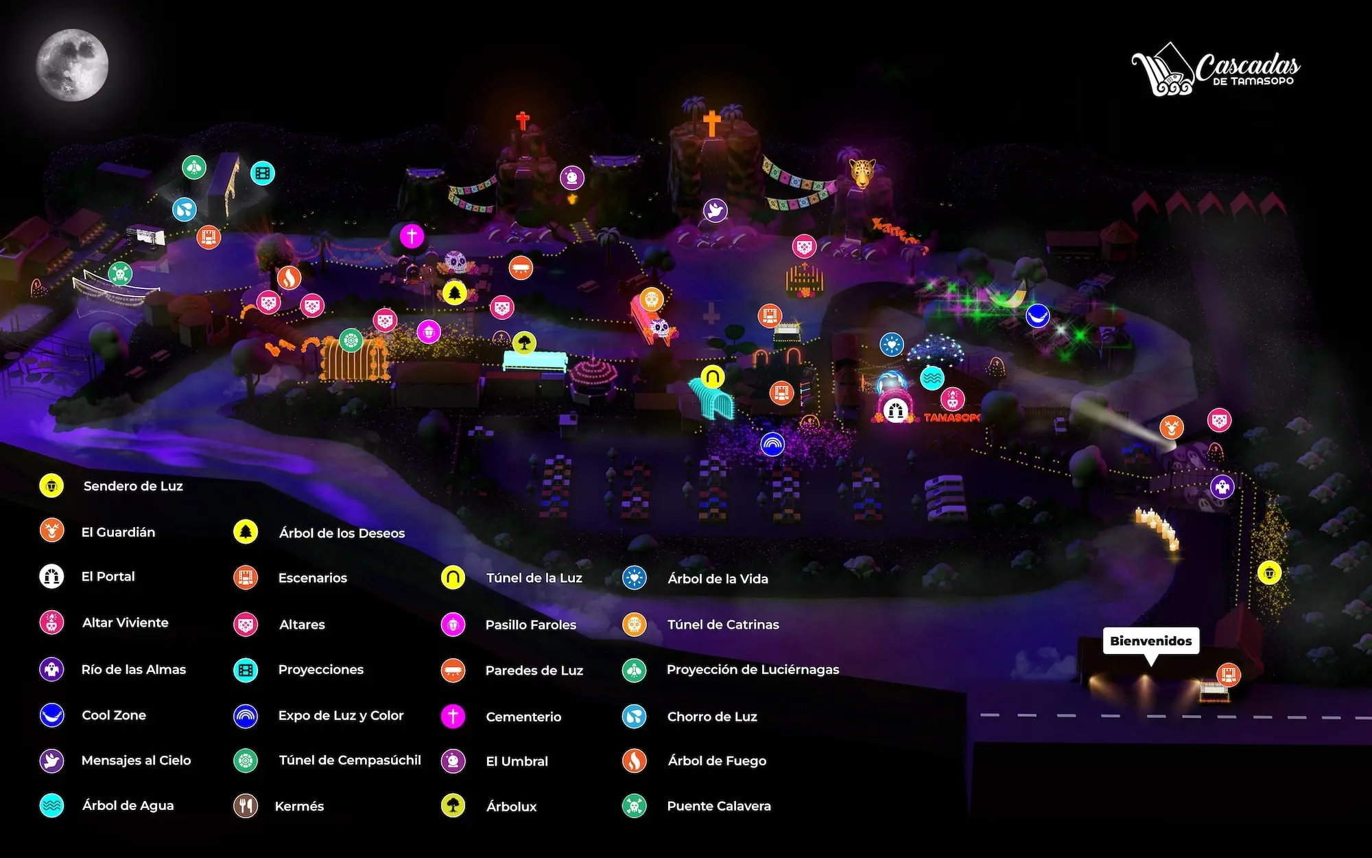 El Guardián / Árbol de los Deseos / El Portal / Altar Viviente / Río de las Almas / Cool Zone / Escenarios / Altares / Túnel de la Luz / Árbol de la Vida / Pasillo de Faroles / Túnel de Catrinas / Proyecciones / Paredes de Luz / Proyección de Luciérnagas / Expo de Luz y Color / Sendero de Luz / Cementerio / Chorro de Luz / Túnel de Cempasúchil / El Umbral / Árbol de Fuego / Mensajes al Cielo / Árbol de Agua / Kermés / Árbolux / Puente Calavera / Comida Típica / Música en Vivo / Y mucho más...